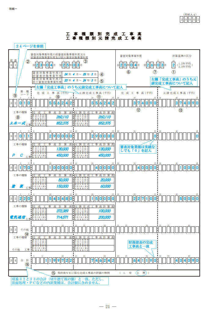 まず、経営事項審査では工事種類別完成工事高(工事種類別元請完成工事高)という書類を提出します。この書類には、1年間の「完成工事高」や「元請完成工事高」の金額を記載するのですが、この「工事高」は1年間に受注した工事の合計金額となります。
