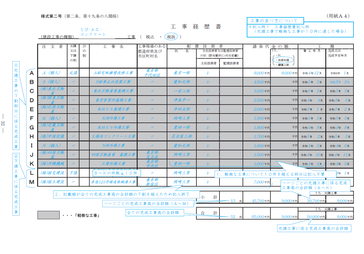 これまでの経営事項審査では、各業種ごとに工事経歴書の上位5件について、工事の裏付け資料を用意する必要がありました。今後(2023年9月以降)は、各業種ごとに工事経歴書の上位3件について用意すればOKとなります。単価契約(元請けの公共工事)の裏付け資料についても、契約書+一覧表+一覧表の金額の大きい順番に上位3件分の指示書、若しくは請求書とその入金資料となります。